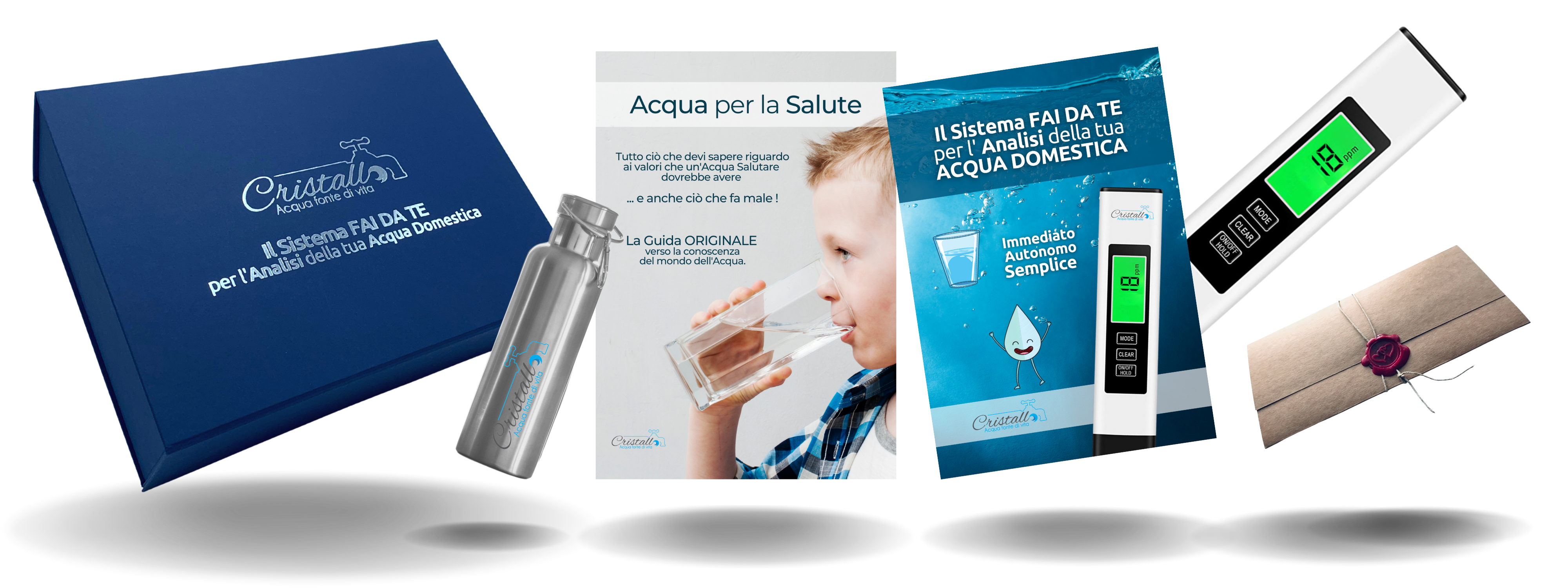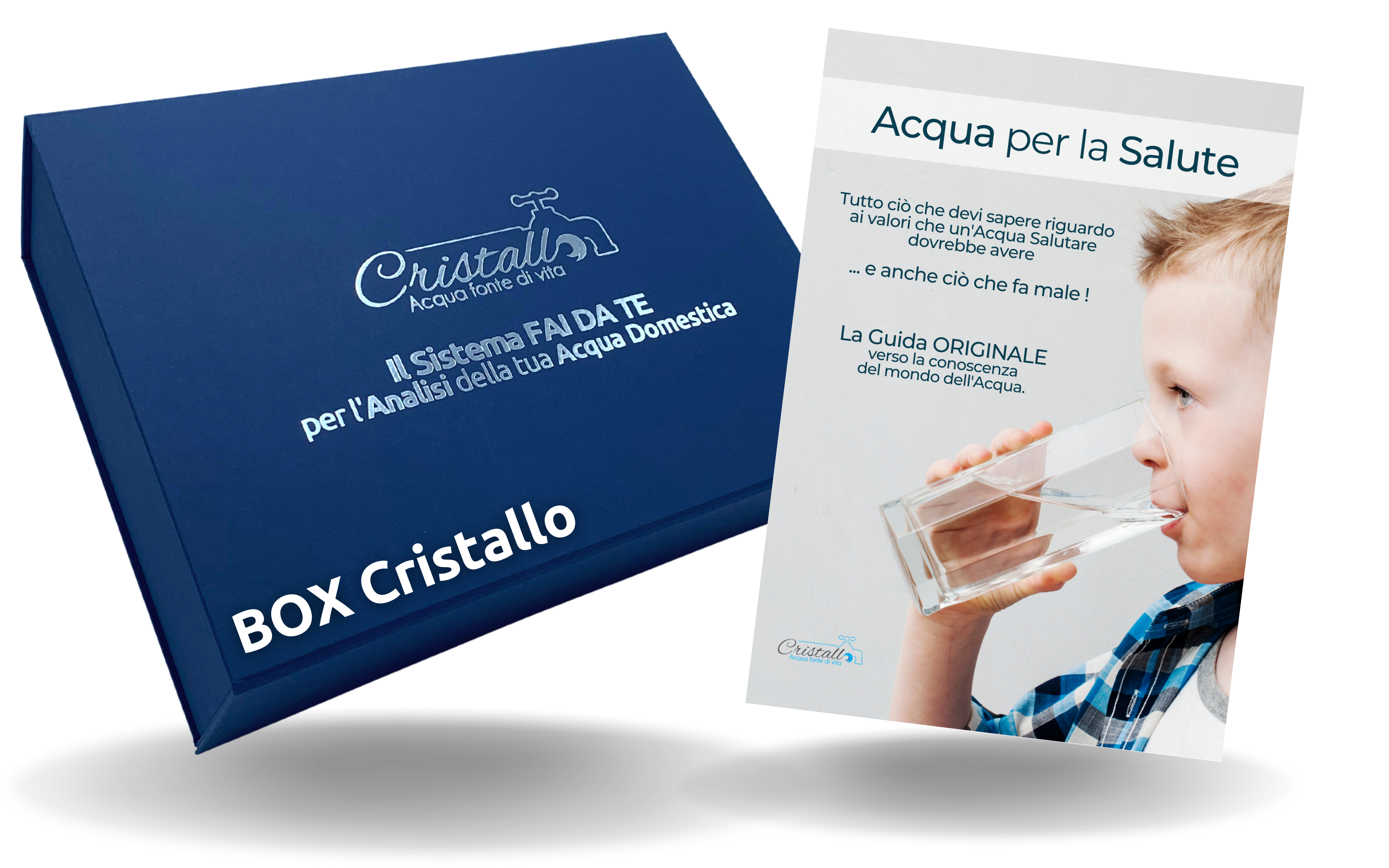 Il BOX Cristallo contiene una serie di materiale, informative e tester che ti guideranno a scoprire in modo estremamente semplice i parametri della tua Acqua