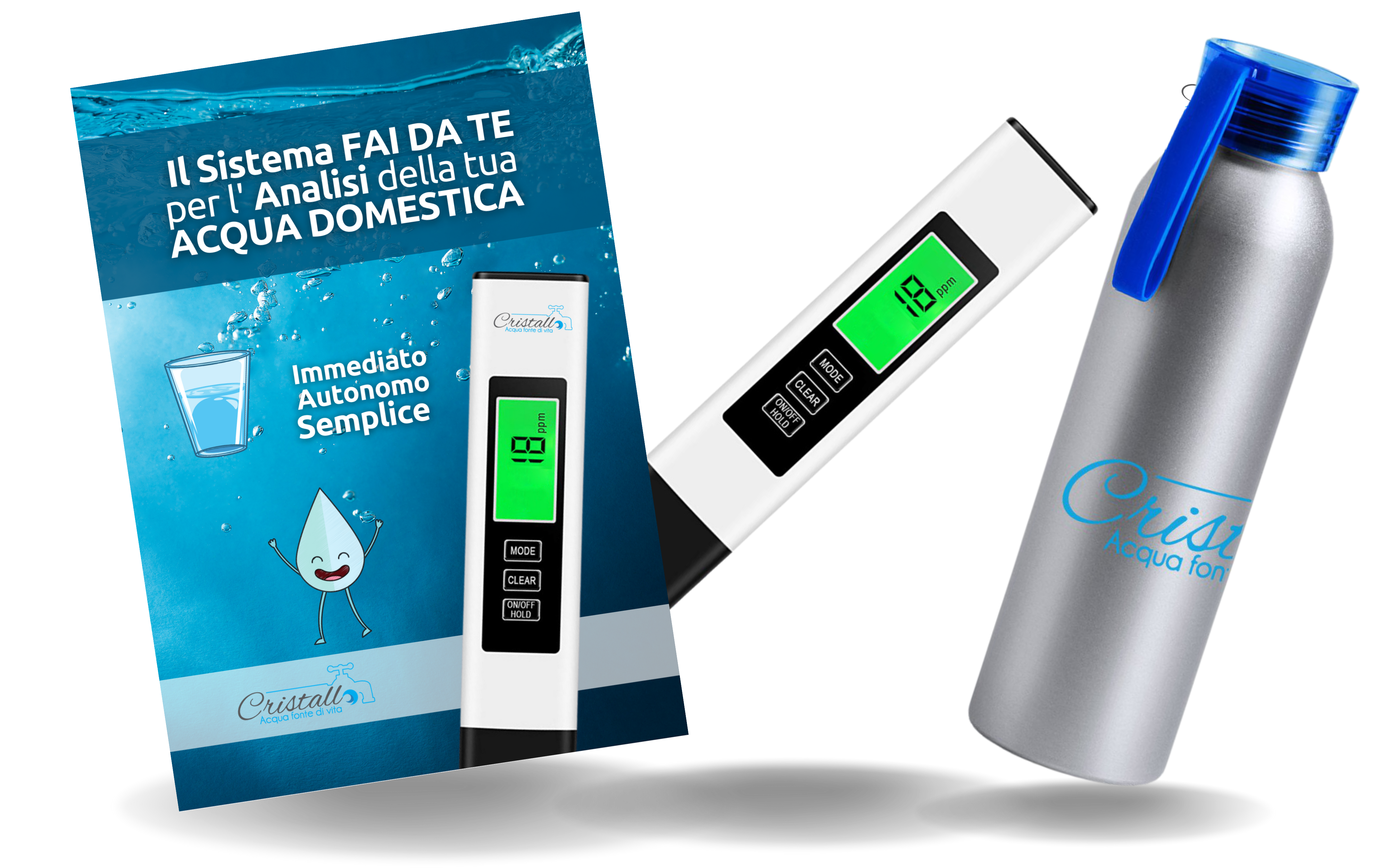 Libri informativi sull'Acqua, Il test autonomo per valutarne la qualità e il suo relativo manuale d'uso, la borraccia personalizzata e una serie di Omaggi Bonus.